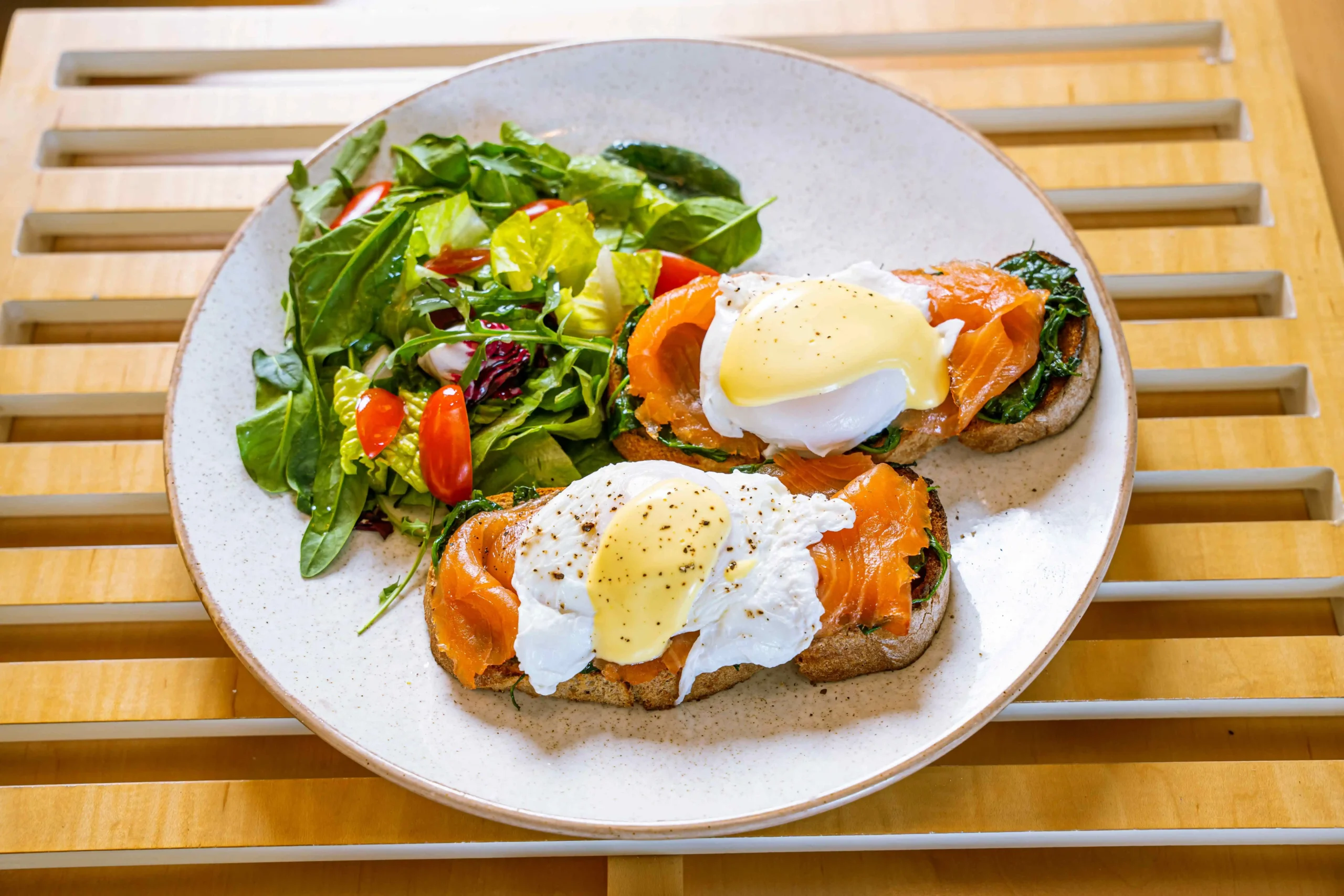 Avocado, poached eggs, hollandaise sauce, turkey ham, garden salad - contains egg